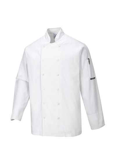 Designed for busy catering professionals, the Dundee jacket is the perfect choice for hot kitchen environments. Features of this stylish jacket include a handy sleeve pocket, French cuffs, 6 rows of white press studs, MeshAir aerated mesh underarms, two piece sleeve and shaped back panels for a contemporary fit.